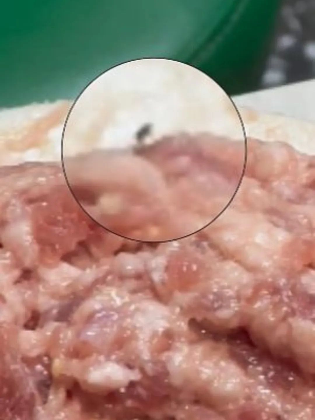 网友称袁记云饺后厨包饺子的肉馅表面有飞虫爬行。图/视频截图